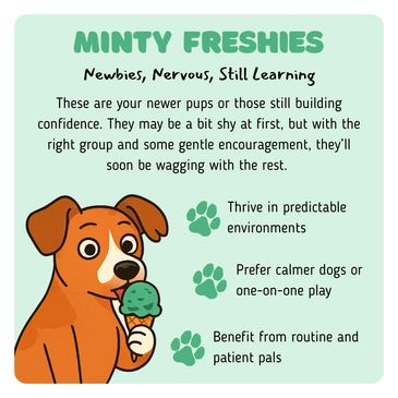 Minty Freshies are the newest pups or those still finding their paws in the world of daycare. They may be a little shy or nervous at first, but with the right encouragement and a supportive group, they'll quickly start to feel at home. These dogs prefer calmer environments and often thrive when matched with patient pals who can help them build confidence.