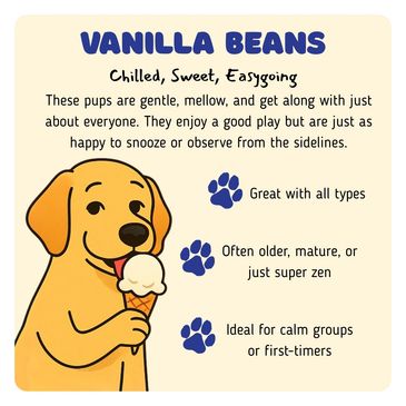 In terms of bookings, Vanilla Beans can join us any day of the week. Since they are great with all dogs and usually prefer a laid-back atmosphere, they’ll fit in perfectly with other mellow pups. You’re welcome to book a session on any day that suits your schedule, knowing your dog will have a fun and stress-free experience.