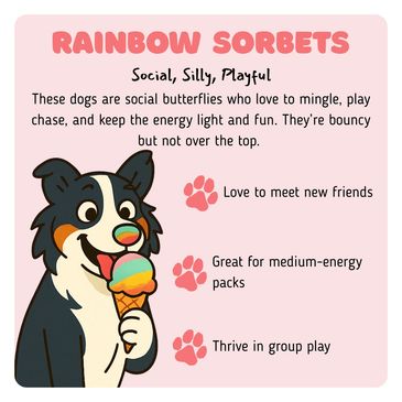 If your dog is a Rainbow Sorbet, they are bursting with personality and love to socialize! These dogs thrive in group play and enjoy mingling with new friends, keeping the energy light and playful. They’re bouncy and full of fun but not overly excitable, making them a great fit for medium-energy groups.