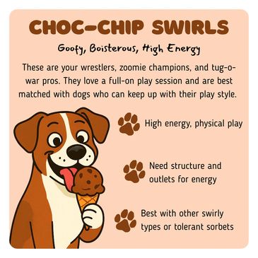 Choc-Chip Swirls are the high-energy, goofball pups who love to wrestle, zoom around, and engage in tug-of-war sessions! These dogs are all about physical play and need other dogs who can match their energy levels. They thrive in a structured environment with plenty of opportunities to burn off their energy.