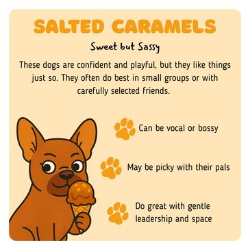 Salted Caramels are adorable with just the right amount of spice! These confident and playful pups have strong personalities and love having fun, but they tend to be a bit picky with their playmates. They often do best in smaller groups or with dogs that have been carefully selected to match their energy and temperament.